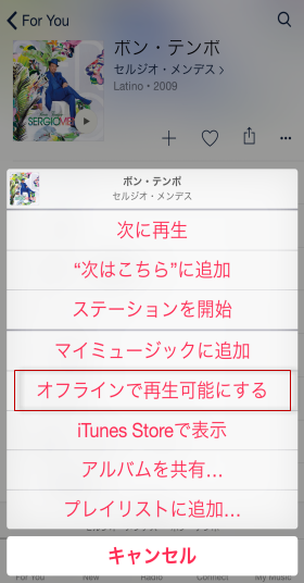 メニューからオフラインで再生可能にするを選びます。